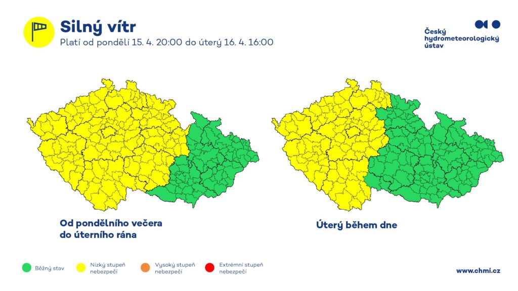Silně má vítr vát zejména během noci na úterý a výstraha bude platit ve všech českých regionech a na Vysočině. Během úterka má podle meteorologů opět vítr zesilovat ovšem v Praze, Středočeském, Karlovarském, Ústeckém, Plzeňském a v částech Libereckého a Jihočeského kraje.