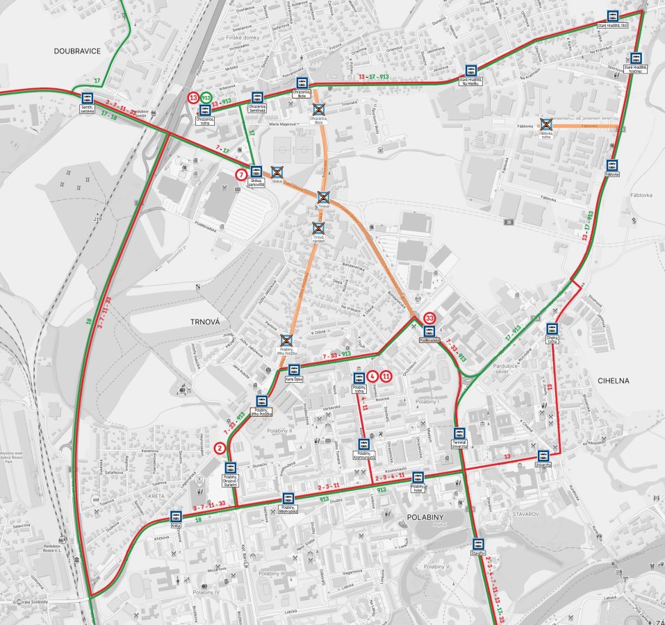 - Linka 18: Spoje ze zastávky Polabiny, Okrajová (Polabiny, Sluneční) budou pokračovat obousměrně objízdnou trasou ulicí Nádražní do zastávky Semtín, zastávka a dále ve své trase. Spoje nebudou obsluhovat zastávku Globus.