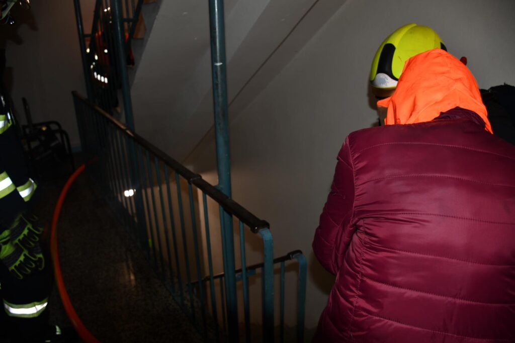 Dobrou práci odvedla na místě Policie České republiky, která před příjezdem našich jednotek z 3. patra budovy evakuovala 8 lidí. Pak už jsme otěže zásahu převzali my. Ustavení žebříku nebylo možné, proto jsme zásah vedli pouze vnitřní zásahovou cestou a k likvidaci požáru byl nasazen jeden prouc C. U požáru jsme nasadili přetlakovou ventilaci a objektovou evakuaci jsme provedli za pomocí vyváděcích masek, při kterých jsme z domu evakuovali 15 lidí. Průzkumem jsme provedli kontrolu 5. – 9. patra, zde byli obyvatelé domu v pořádku a otevřeli si okna. Provedli jsme odvětrání všech pater, evakuované osoby, které byly dočasně umístěny ve vedlejším vchodu se po likvidaci požáru mohly vrátit do svých bytů.