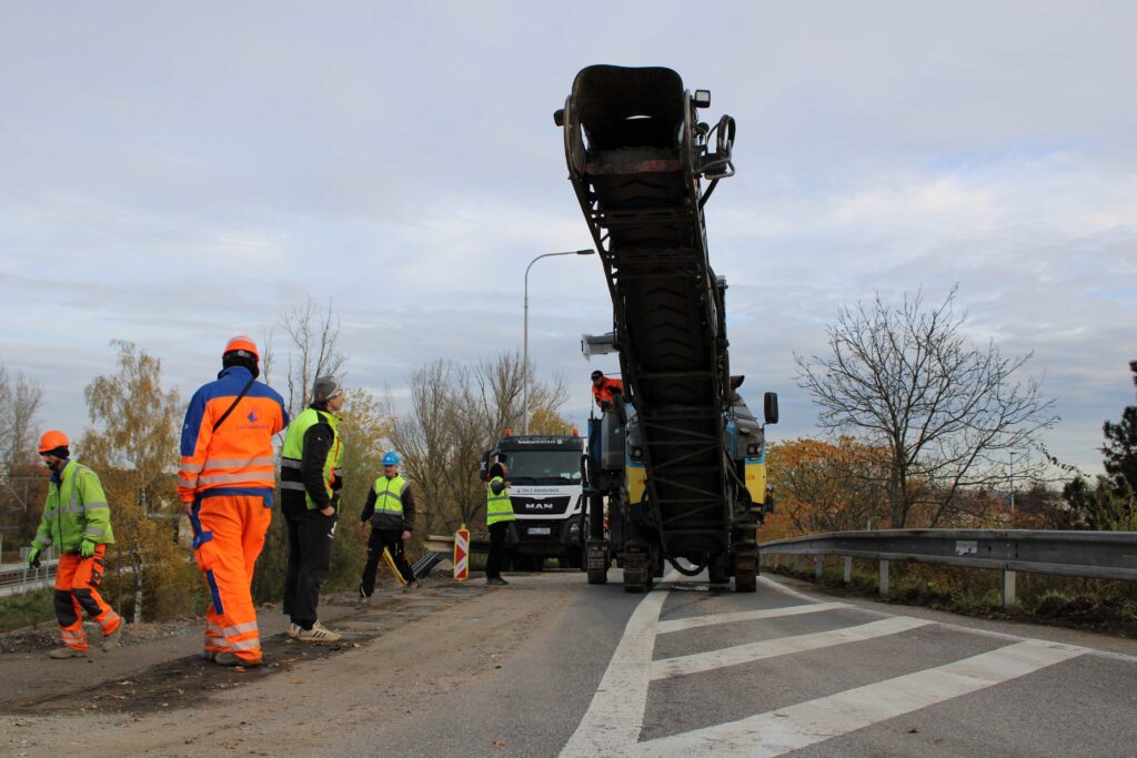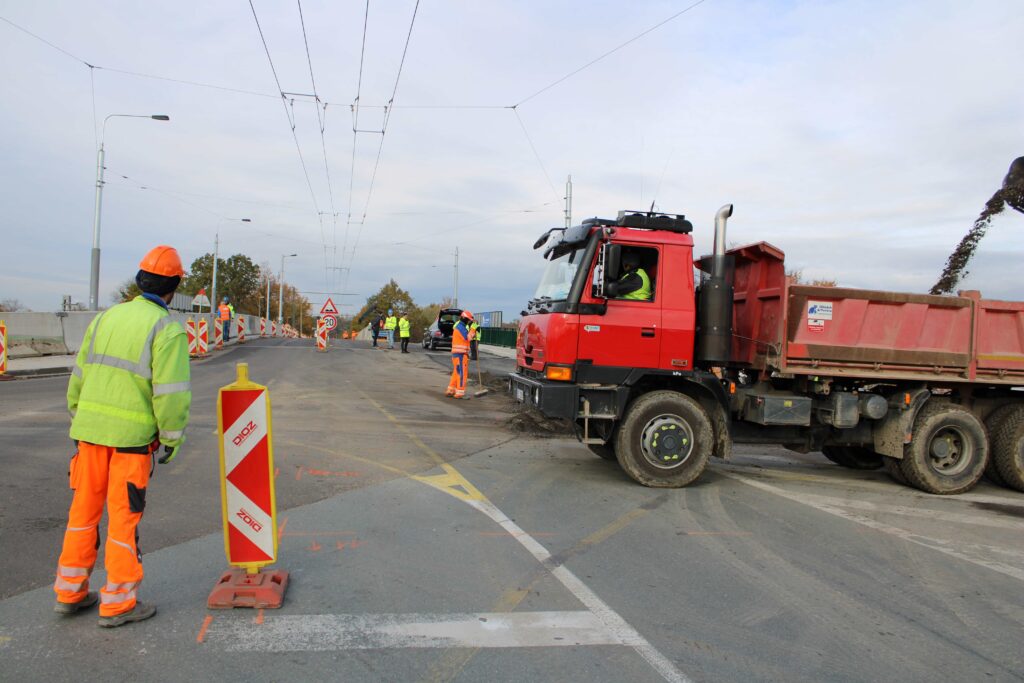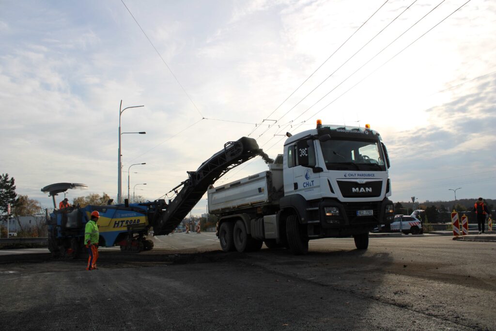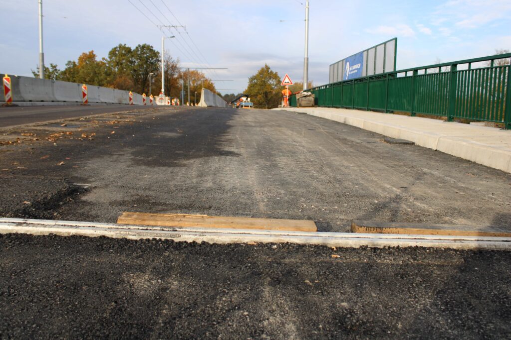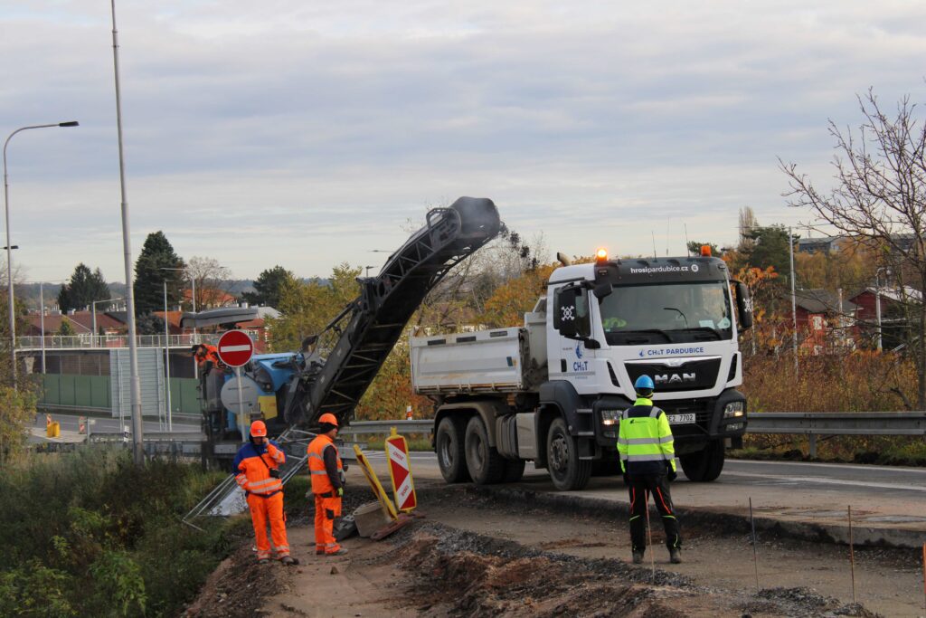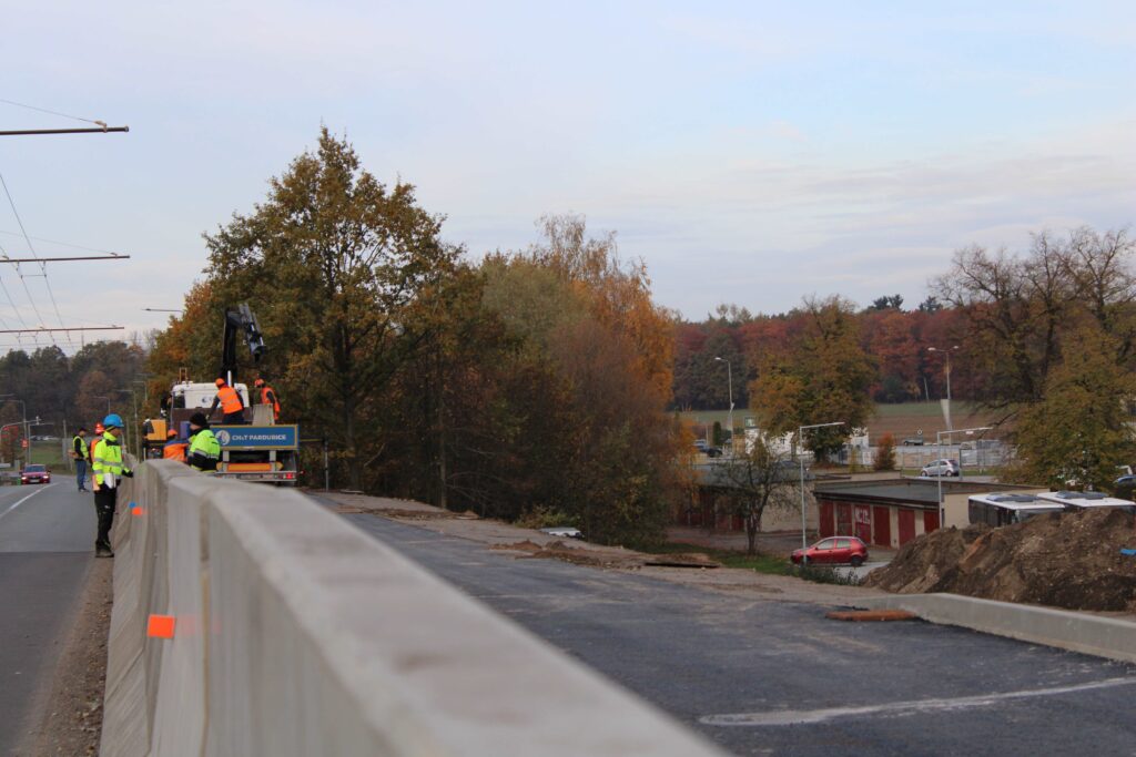 Na novém mostě v Pardubicích – Doubravicích v pondělí 13. listopadu stavbaři začali dokončovat napojení mostu na stávající silnici I/36. Silničáři tu frézují vozovku a následně budou instalovat sloupy trakčního vedení, zábradlí a svodidla. Řidiči tu tak musí počítat s komplikacemi.