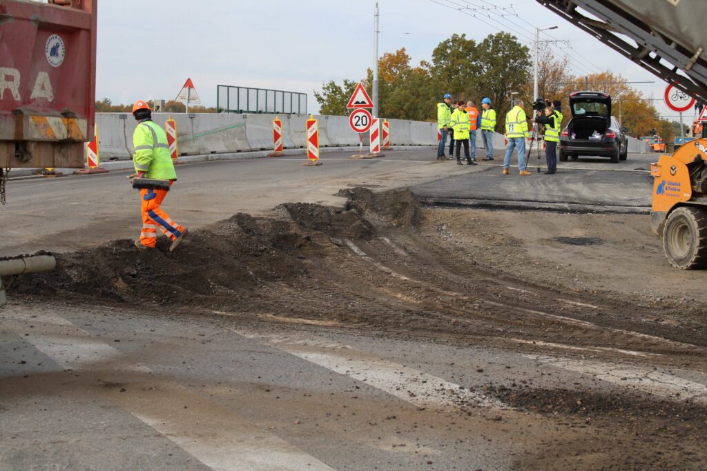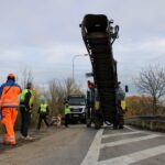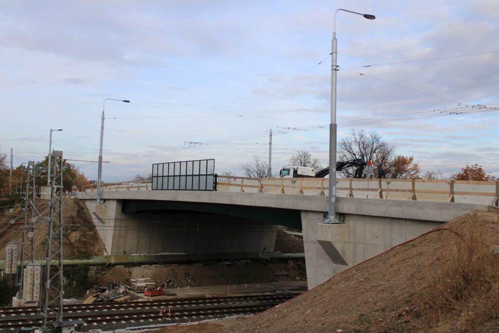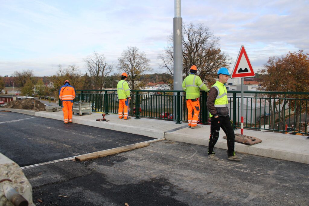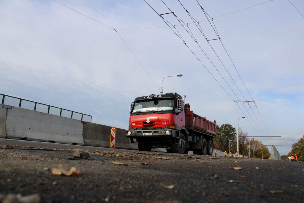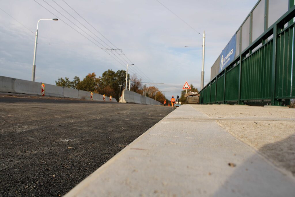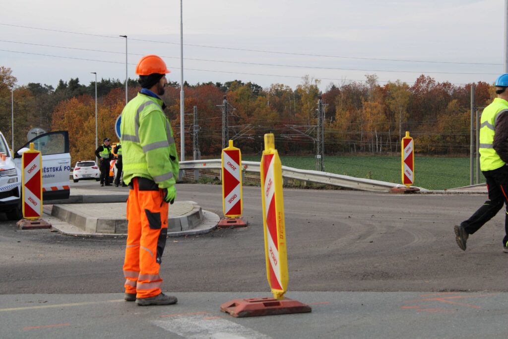 Na novém mostě v Pardubicích – Doubravicích v pondělí 13. listopadu stavbaři začali dokončovat napojení mostu na stávající silnici I/36. Silničáři tu frézují vozovku a následně budou instalovat sloupy trakčního vedení, zábradlí a svodidla. Řidiči tu tak musí počítat s komplikacemi.