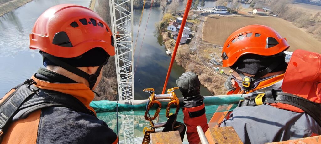 Cílem cvičení bylo vyzkoušet si lezecké záchrany, které se v prostorách této charakteristické mostní konstrukce mohou objevit.