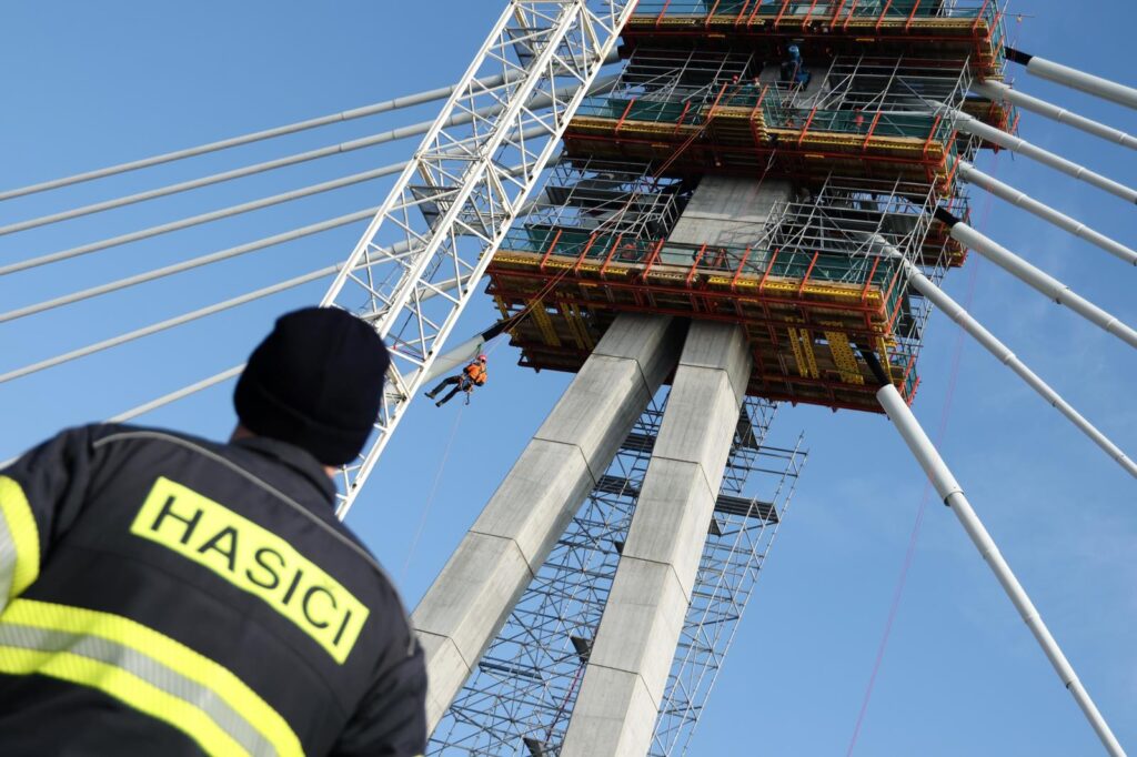„Na stavbě jsme rozjeli hned tři zajímavé scénáře. Záchranu dělníka z pylonu, kterého jsme transportovali na most. Poté si lezci zkusili zachránit jeřábníka, kterému se udělalo nevolno v kabině jeřábu. Posledním scénářem bylo vytvoření tzv. lanového traverzu mezi jeřábem a pylonem, po kterém jsme se všichni lezci přesunuli,“ říká instruktor hasičů-lezců pprap. Radim Jehlička ze stanice Pardubice.