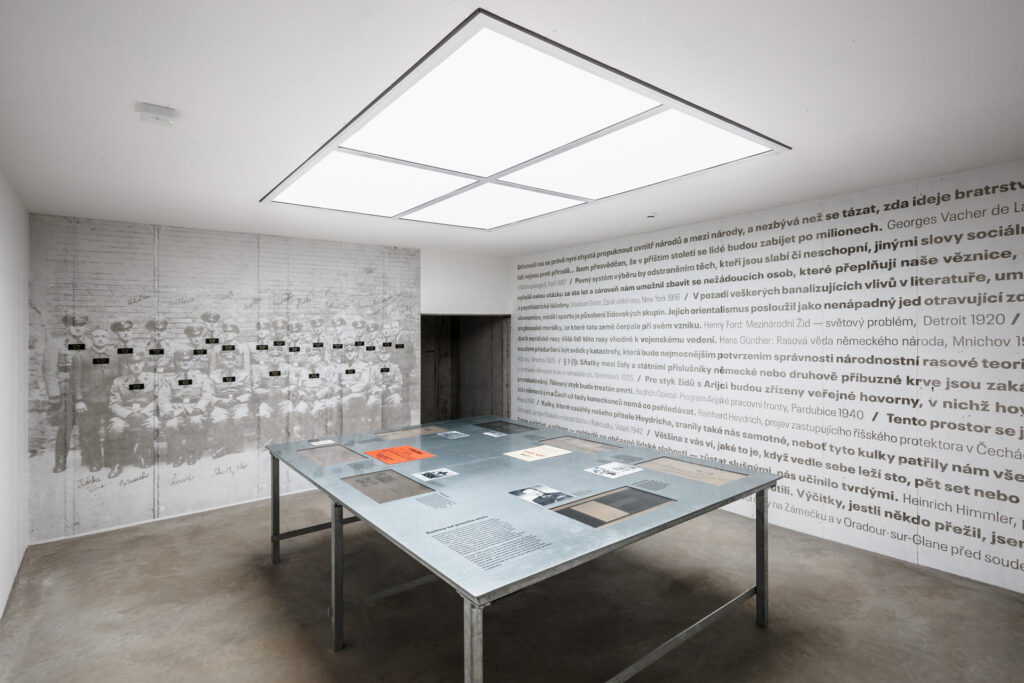 Vše pak zasazuje do kontextu předválečného a poválečného dění. Návštěvnický zážitek umocňuje architektonické provedení památníku, které pracuje se syrovými materiály jako je beton nebo ocel, s hrou světla a stínu či svažující se podlahou.