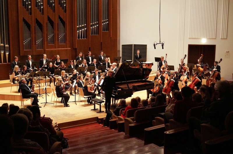 Fotografie 1: Jeden z nejlepších absolventů, klavírista Matyáš Novák, se Symfonickým orchestrem Konzervatoře Pardubice. Na podiu je klavír Steinway v ceně asi 5 milionů korun, v podobné kvalitě je třeba dovybavit Malý a Komorní sál.