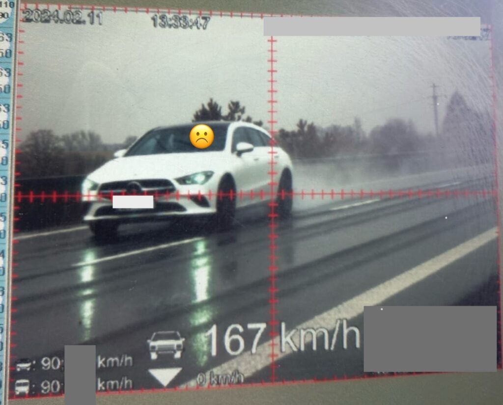 Policisté z dopravního inspektorátu Svitavy trávili nedělní odpoledne dohledem nad dodržováním rychlostních limitů. Krátce po půl druhé hodině zachytili na silnici I/43 vozidlo značky Mercedes, které po mokré vozovce uhánělo rychlostí 167 km/h, přitom v místě je povolena maximální rychlost 90 km/h. Po odečtení tolerance tak 37letý řidič překročil dovolenou rychlost o 71 km/h. Policisté proto využili svého oprávnění vyplývajícího z novely zákona a muži na místě zadrželi řidičský průkaz. Ve správním řízení mu nyní hrozí pokuta až 25 tisíc korun a zákaz řízení až na 18 měsíců.