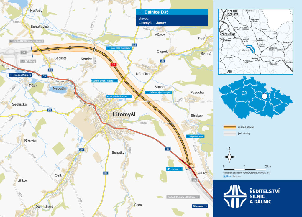 Ředitelství silnic a dálnic (ŘSD) začalo stavět 10,4 kilometru dlouhý úsek dálnice D35 Litomyšl – Janov v Pardubickém kraji. Cena stavby dálničního obchvatu Litomyšle, která vzešla z výběrového řízení, je 2,8 miliardy Kč bez DPH, větší část nákladů uhradí EU. Řidiči by měli po obchvatu jezdit od léta 2027.