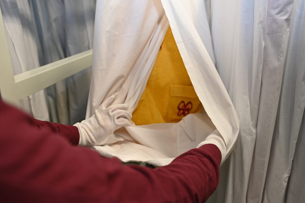 Přesun textilních sbírek je náročný proces, při kterém je třeba dbát na řadu specifických podmínek. Před samotným stěhováním se prostory ošetřují proti škůdcům, kteří by mohli textilie poškodit. „Samotné předměty jsou uloženy buď v archivních krabicích, nebo zavěšené na ramínkách v plátěných ochranných obalech. Při transportu se převážejí opatrně ve stojanech v dodávce a následně se zavěšují do nových depozitárních regálů. Ohled musíme brát i na počasí – textil se přenáší pouze za sucha. U jemných materiálů je navíc nutné zabránit posunům a mechanickému poškození,“ popisuje stěhování sbírky její kurátorka Tereza Mazancová.