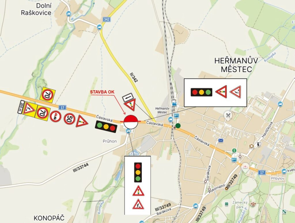 „Nová křižovatka zajistí větší plynulost a bezpečnost provozu, a především zpomalí vjezd do Heřmanova Městce ve směru od Čáslav, podle posledního sčítání dopravy projede místech na 8 500 aut za den. Doprava bude vedena stavbou, v pracovní době řízena školenými pracovníky a mimo pracovní dobu trojcestným signalizačním zařízením,“ uvedlo ŘSD na síti X.