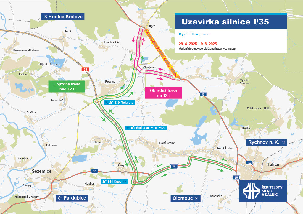 Uzavírka spojená s opravou komunikace začne platit od pondělí 28. dubna, a to mezi obcemi Býšť a Cvojenec. „Řidiči pozor! Od pondělí 28.4. bude zahájena oprava silnice I/35 v úseku mezi Býští a Chvojencem, s níž je spojena i úplná uzavírka komunikace I/35. Dokončení je v plánu v první polovině června,“ uvedlo ŘSD na síti X.
